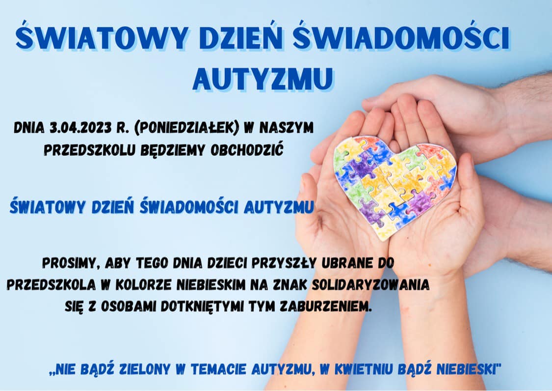Dnia 03.04.2023r. (Poniedziałek) w naszym przedszkolu będziemy obchodzić Światowy Dzień Świadomości Autyzmu.