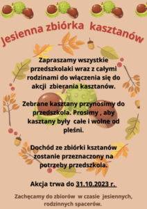 Organizujemy w naszym przedszkolu zbiórkę kasztanów i żołedzi dla zwierząt leśnych, które można przynosić do 18.11.2022 r. (Ogłoszenie) (Plakat (orientacja pionowa)) (Baner (w poziomie)) (Plakat ( 19 września 2023 pp6 No comments