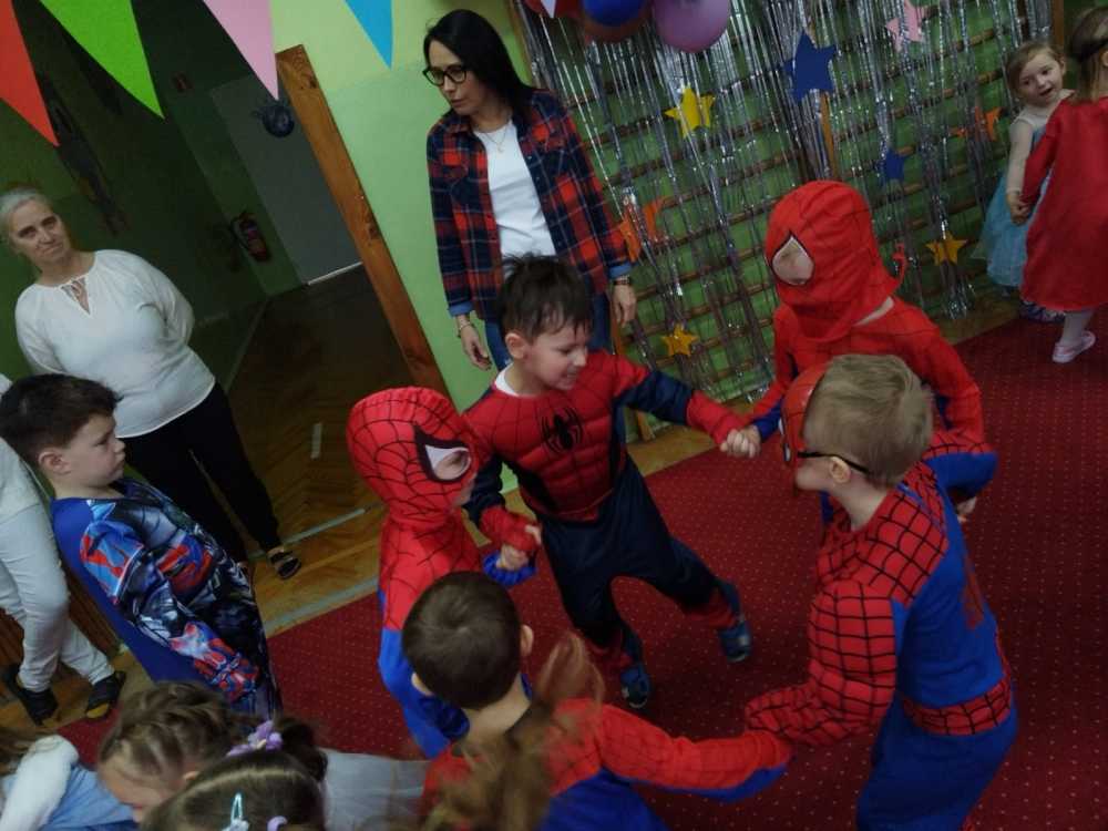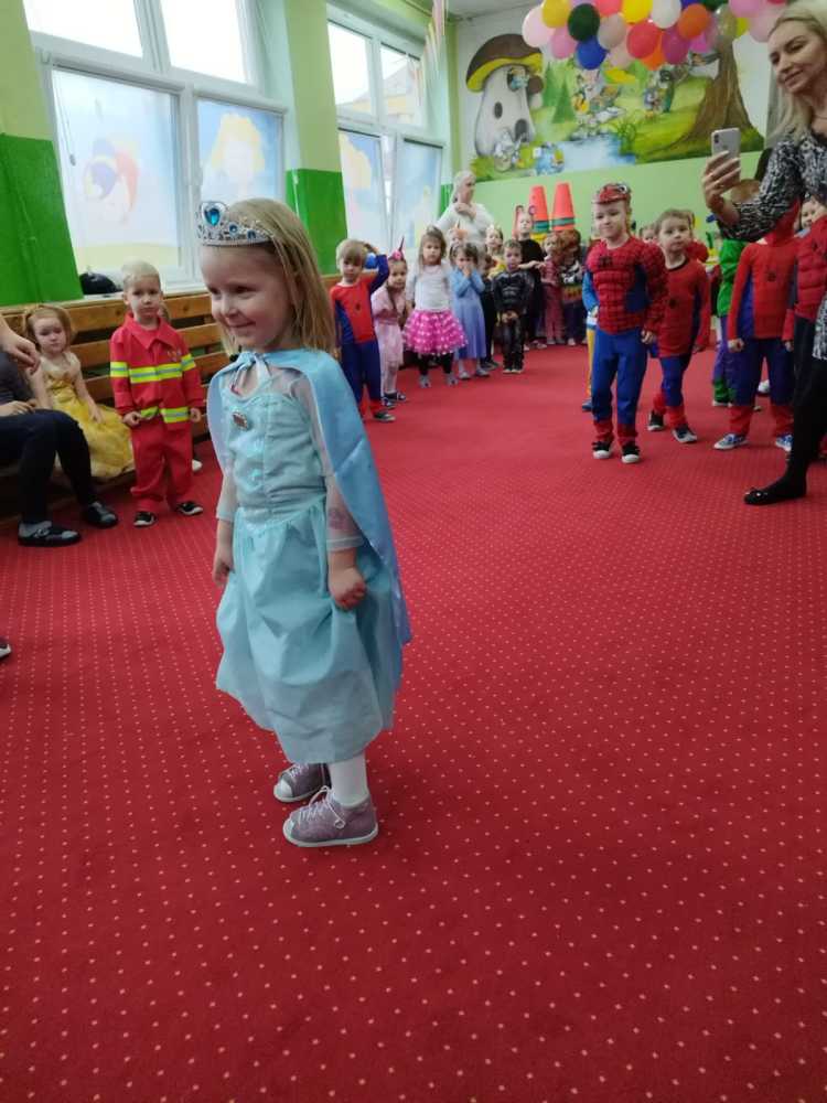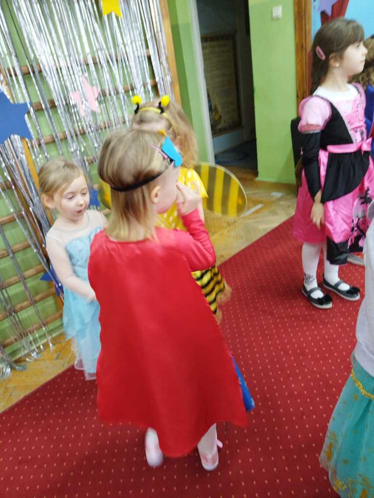 W naszym przedszkolu od rana panował gwar i wyczekiwanie na rozpoczęcie balu. W tym dniu jak zapewne się domyślacie można było spotkać wróżki, królewny,motylki, rycerzy, strażaków, Spider-Mana, lwa, pszczółkę,… nie sposób zliczyć i wymienić tych wszystkich postaci. Rozpoznać dzieci było bardzo trudno. Kiedy pojawiły się pierwsze rytmy wesołej muzyki, wszystkie przedszkolaki z wielką ochotą rozpoczęły pląsy i tańce. Wszyscy bawili się znakomicie. Były „tańce – łamańce”, „pociąg”, „kaczuchy” … Jednym słowem zabawa na 102!!!