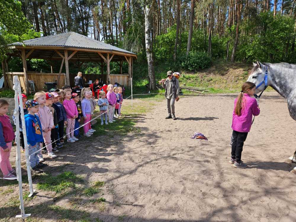 W dniu 08.05.2024r. przedszkolaki z grupy 3 i 4 latków udały się na wycieczkę do stadniny koni „Diablo” mieszczącej się we Włocławku na ul. Rudej. Celem wycieczki było promowanie jazdy konnej, jako aktywności mającej pozytywny wpływ na zdrowie oraz rozwijanie zainteresowań i aktywnego spędzania czasu wolnego. Dzieci zapoznały się z zasadami chowu i pielęgnacji koni. Oglądały stajnie i boksy, miały także okazję nakarmić koniki smakołykami. Wysłuchały wielu ciekawych informacji o hodowli koni. Następnie uczestniczyły w jeździe konnej co było dla nich niesamowitym przeżyciem.