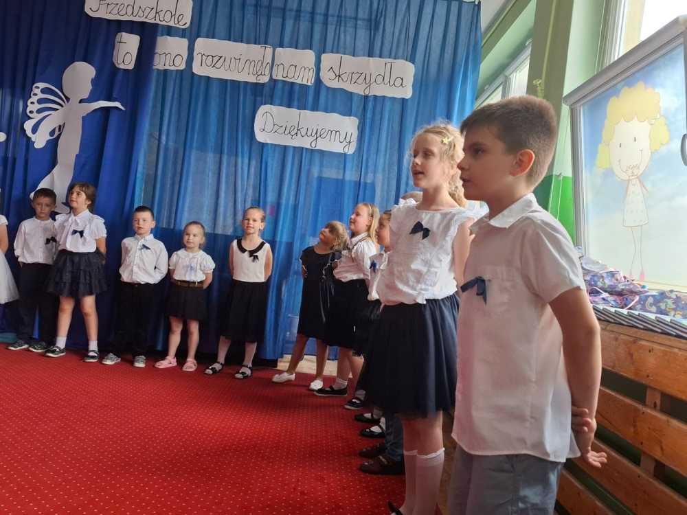 19 czerwca odbyła się uroczystość zakończenia przedszkola. Tego dnia dzieci 6 – letnie żegnały się ze swoimi paniami, całym personelem, a także młodszymi kolegami i koleżankami. Starszaki poprzez wiersze, piosenki i tańce podziękowały wszystkim pracownikom za czas spędzony w przedszkolu, dobre serce, opiekę, przekazaną wiedzę oraz umiejętności. Nie obyło się bez łez wzruszenia…