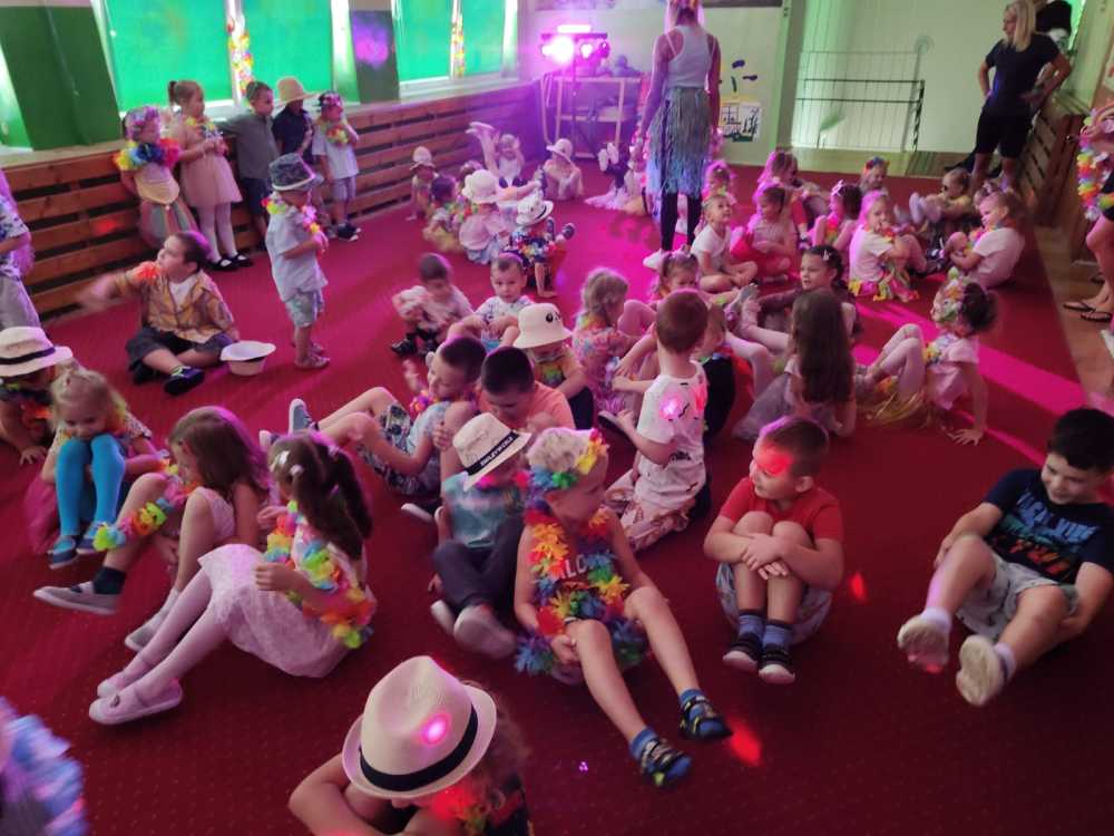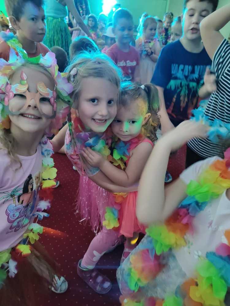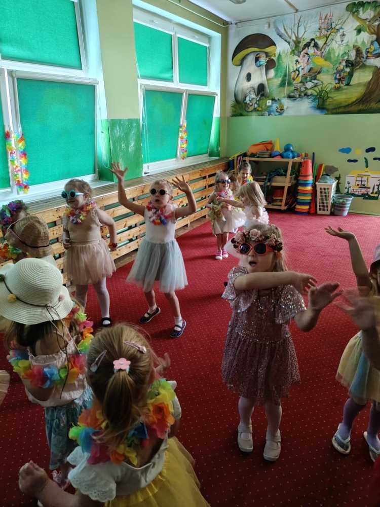 Dzieci wyruszyły w podróż pełną niespodzianek na Hawaje. Już od samego rana były zachwycone wystrojem sali i przebraniami. Było dużo dobrej zabawy i pląsów przy ulubionej muzyce. Radość i śmiech świadczyły o wspaniałej zabawie. Na koniec na wszystkie przedszkolaki w ich salach czekały pyszne malinowe torty.