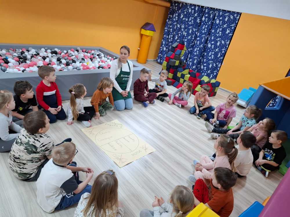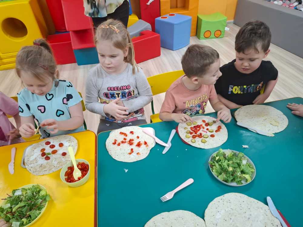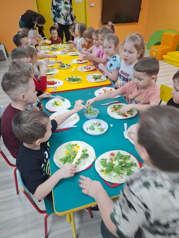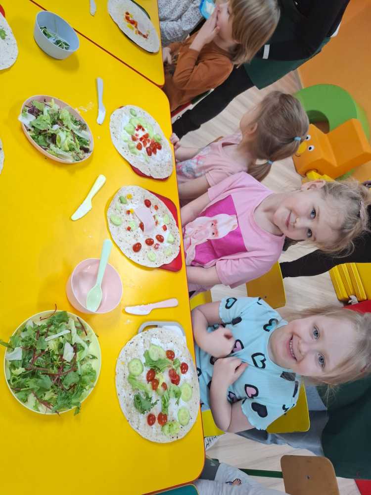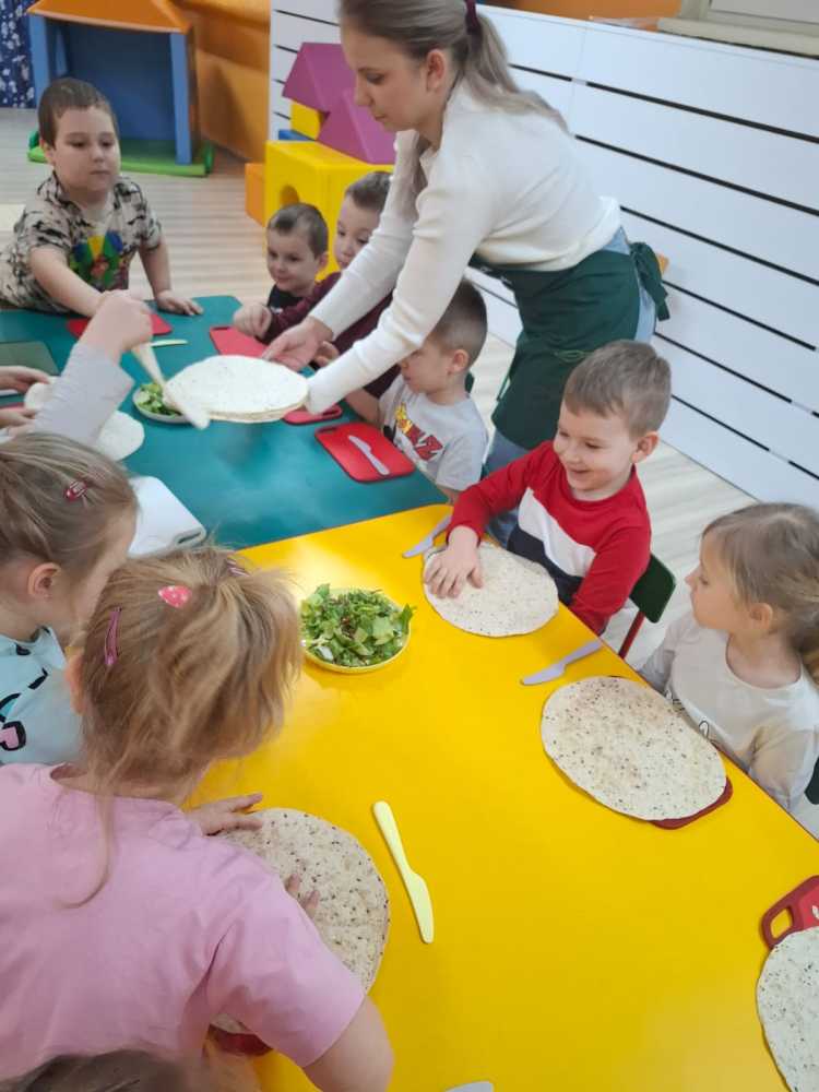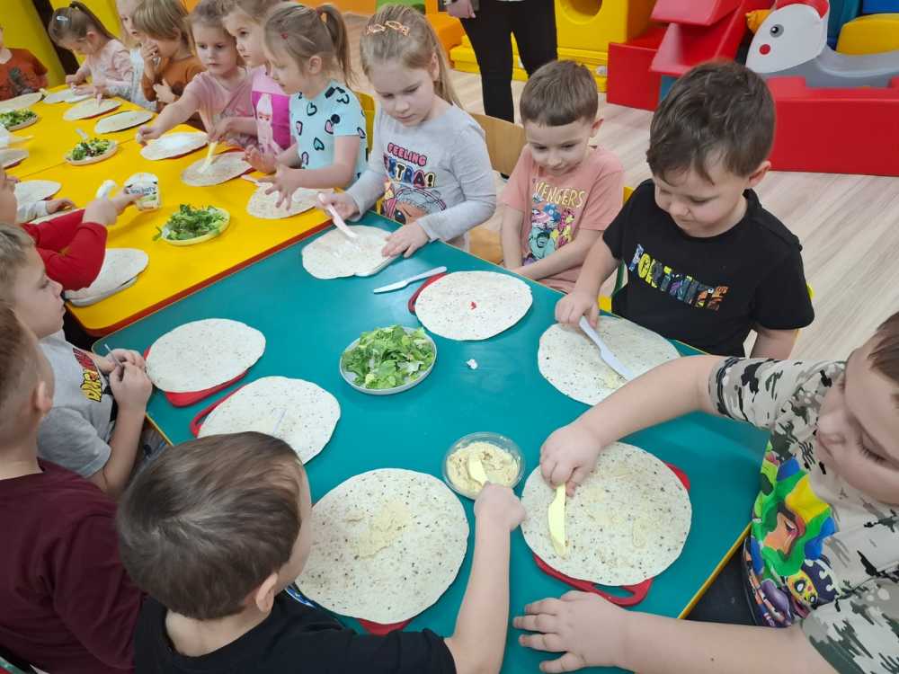 15.01 w naszym przedszkolu odbyły się warsztaty kulinarne zdrowego odżywiania. Podczas spotkania dzieci poznały podstawowe zasady prawidłowego odżywania .  Zapoznały się również ze „zdrowym talerzem”, czyli co i w jakich proporcjach powinno się na nim znaleźć.  Pani  tłumaczyła dzieciom, dlaczego należy ograniczyć słodycze i słodkie napoje, a zwiększyć ilość spożywanych owoców i warzyw. Następnie przedszkolaki samodzielnie przygotowały tortille ze zdrowymi dodatkami. Podczas degustacji przygotowanych przez siebie tortilli na twarzach dzieci malowały się uśmiechy, takie wyszły im pyszne.