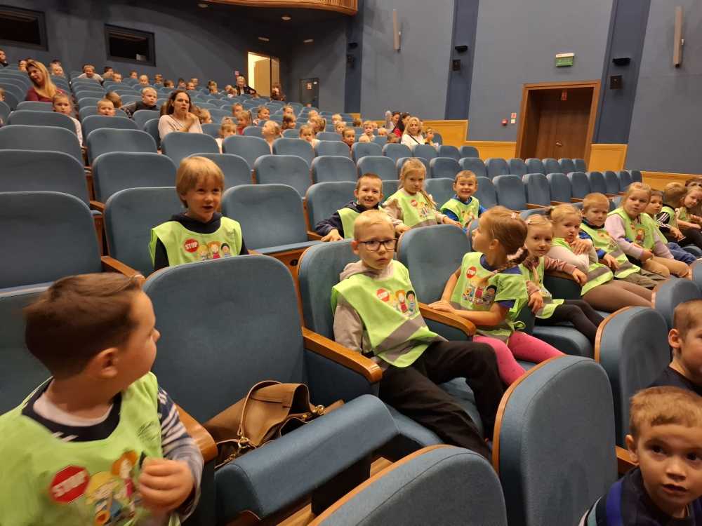 Wyjście grup 5 i 6 latków do Teatru Impresaryjnego na spektakl ,,Przygody Baltazara Gąbki i Wawelskiego Smoka”