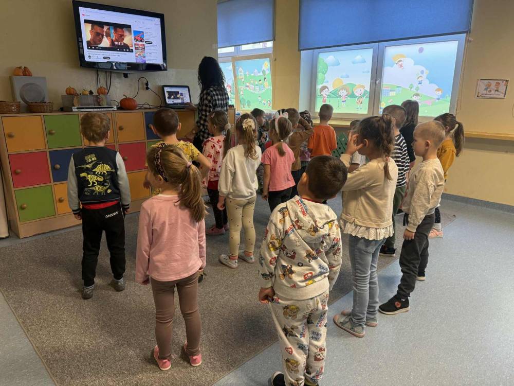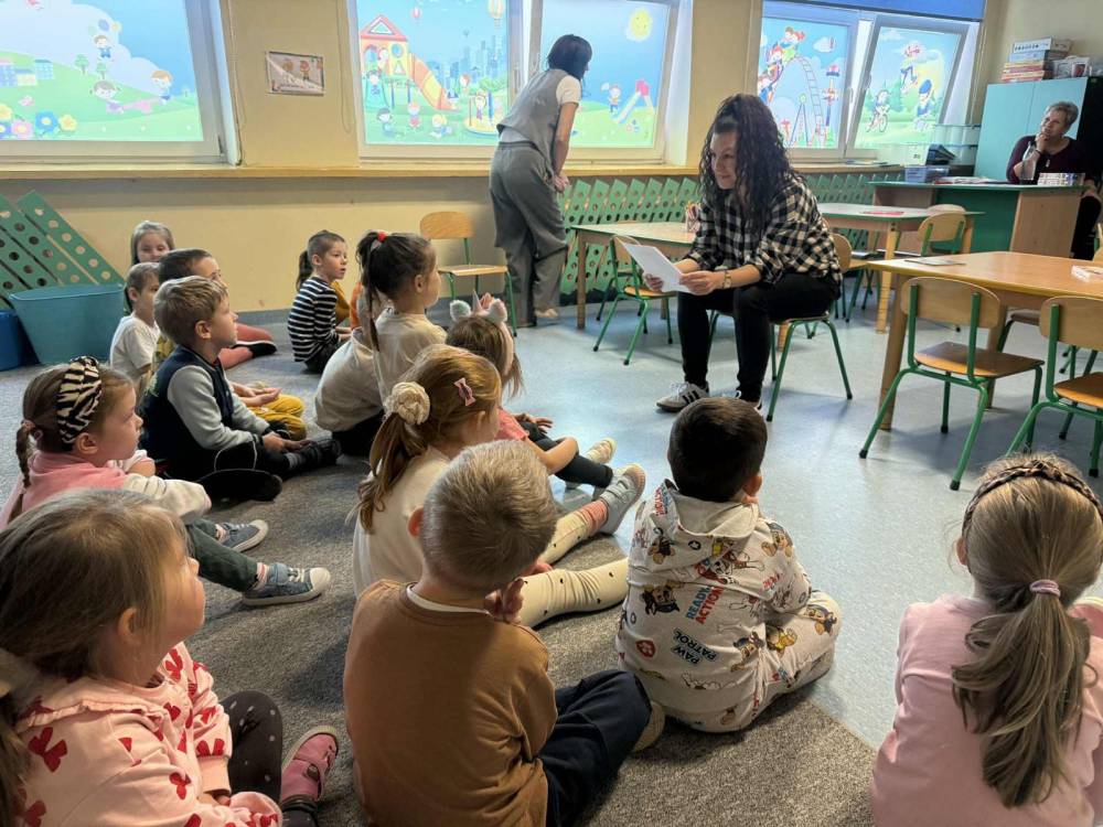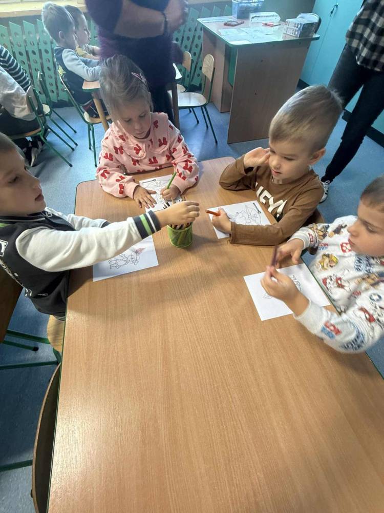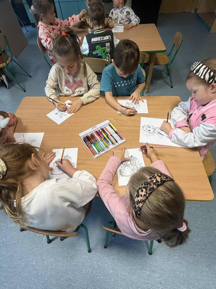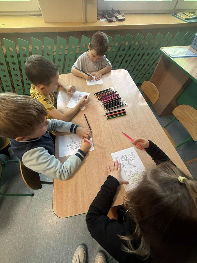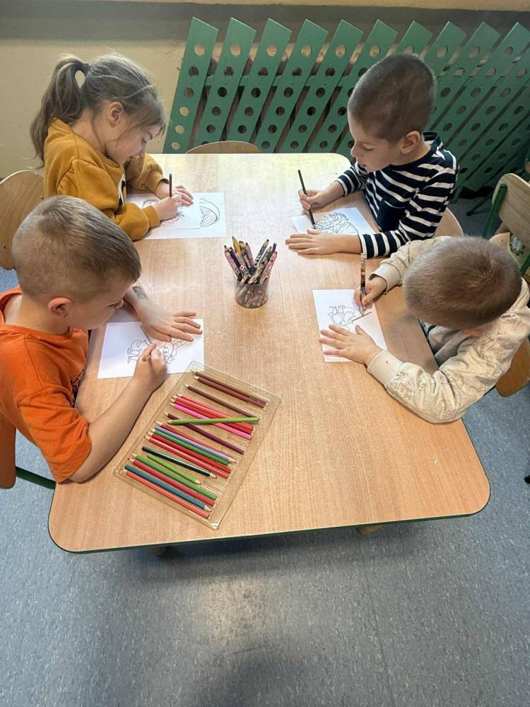 Grupa 5 latków uczestniczyła w zajęciach świetlicowych pt. 'W świecie bajek”, podczas których dzieci przeniosły się w kolorowy świat książek. Na powitanie wszyscy wspólnie poruszali się w rytm piosenki „Witajcie w naszej bajce”, co wprowadziło radosną i energiczną atmosferę. Następnie uczniowie rozwiązywali zagadki dotyczące bohaterów znanych bajek, wykazując się świetną pamięcią i spostrzegawczością. Kolejnym punktem zajęć było głośne czytanie bajki „Złotowłosa i trzy misie”, które dzieci wysłuchały z dużym zainteresowaniem. Na zakończenie uczestnicy zajęć kolorowali postacie z różnych bajek, rozwijając przy tym swoją kreatywność oraz sprawność manualną.