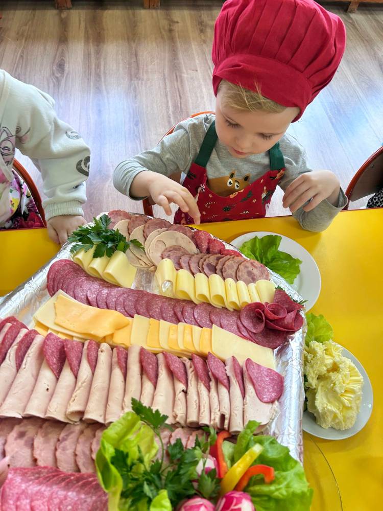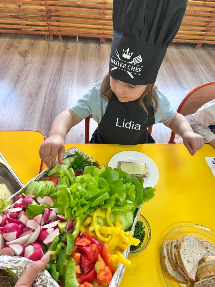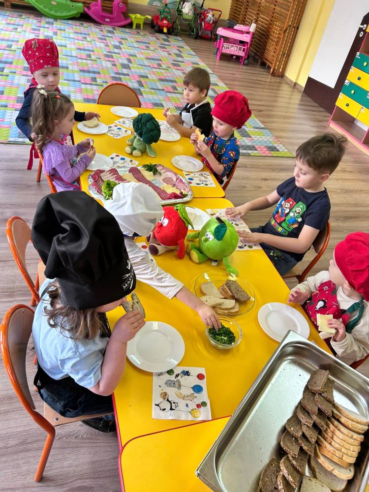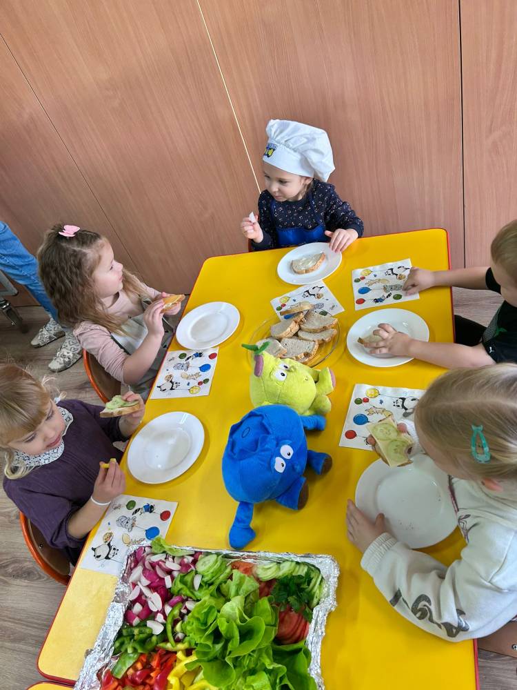 W ramach ogólnopolskiej akcji „Śniadanie daje moc” dzieci utrwaliły wiedzę na temat zdrowego odżywiania oraz roli pełnowartościowego śniadania w codziennym funkcjonowaniu. Podczas zajęć przypomniały sobie, jak ważne jest wybieranie produktów bogatych w witaminy i składniki odżywcze, a także jak ogromne znaczenie ma picie wody dla zdrowia i dobrego samopoczucia. Najważniejszym punktem zajęć było samodzielne przygotowanie zdrowego śniadania. Dzieci z zaangażowaniem komponowały swoje kanapki, ucząc się przy tym właściwych nawyków żywieniowych oraz rozwijając samodzielność.