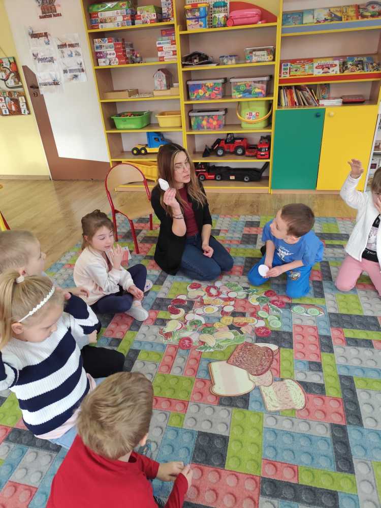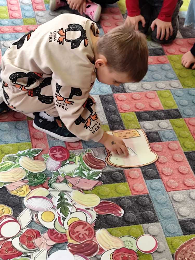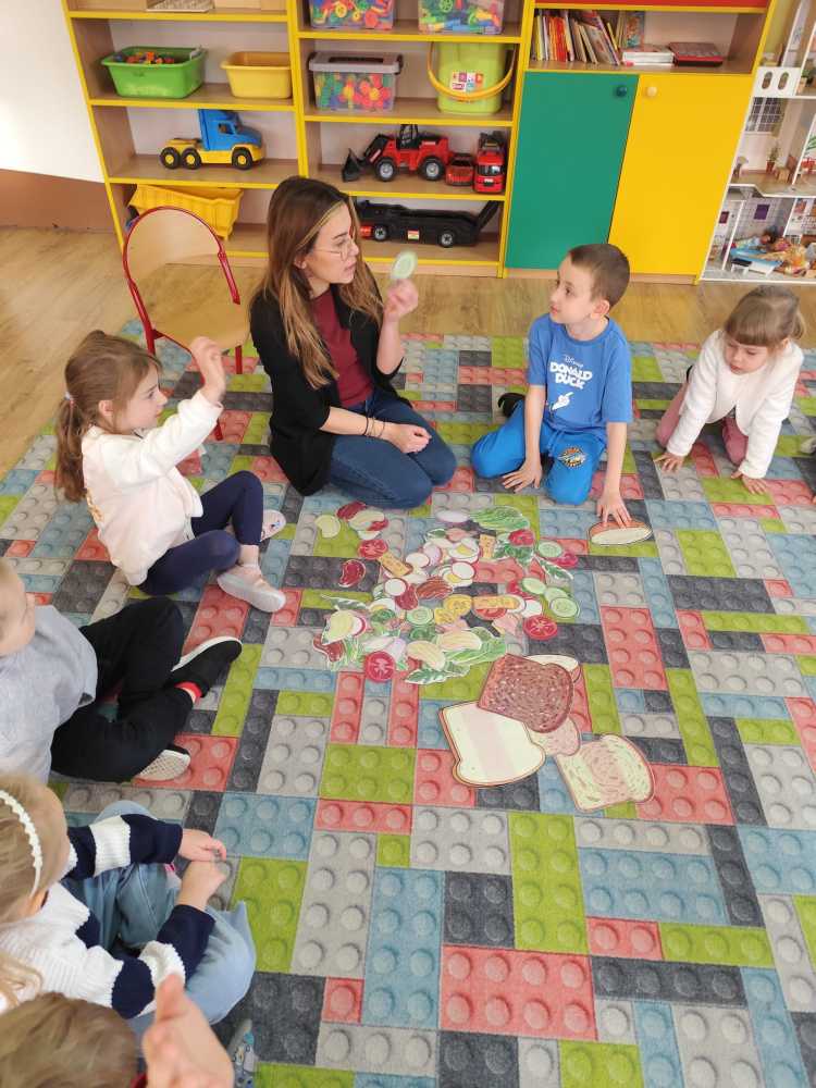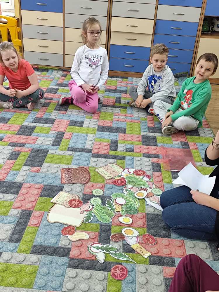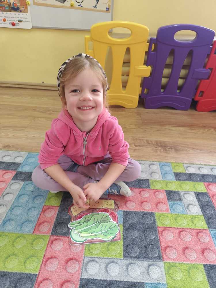 W ramach ogólnopolskiej akcji „Śniadanie daje moc” dzieci utrwaliły wiedzę na temat zdrowego odżywiania oraz roli pełnowartościowego śniadania w codziennym funkcjonowaniu. Podczas zajęć przypomniały sobie, jak ważne jest wybieranie produktów bogatych w witaminy i składniki odżywcze, a także jak ogromne znaczenie ma picie wody dla zdrowia i dobrego samopoczucia. Najważniejszym punktem zajęć było samodzielne przygotowanie zdrowego śniadania. Dzieci z zaangażowaniem komponowały swoje kanapki, ucząc się przy tym właściwych nawyków żywieniowych oraz rozwijając samodzielność.