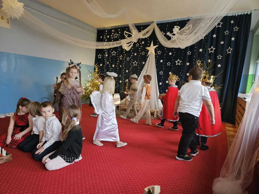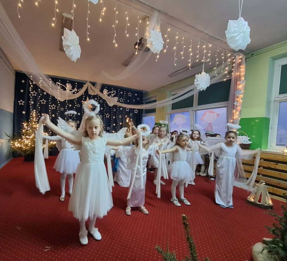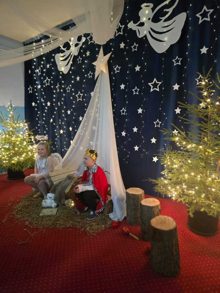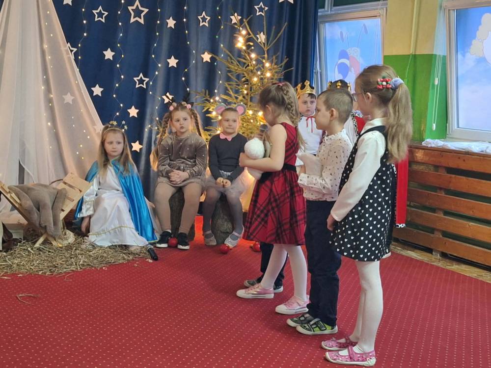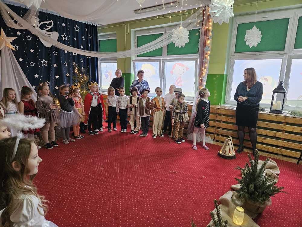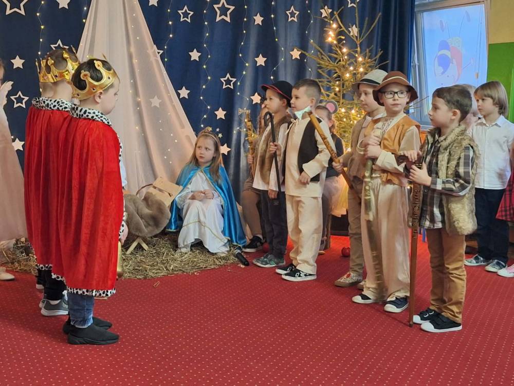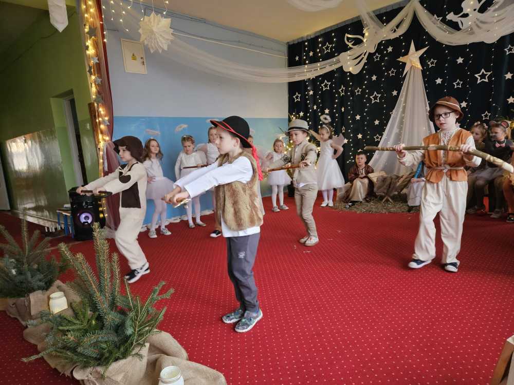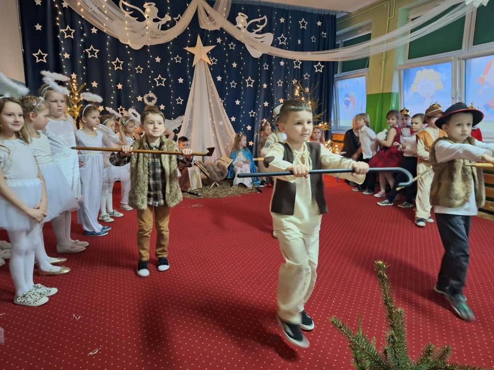 18 grudnia 2025 r. w naszym przedszkolu odbyły się Jasełka Bożonarodzeniowe przygotowane przez grupę 6 –latków . Przedstawienie było wyjątkowe. Mali aktorzy z ogromnym zaangażowaniem i radością wcielili się w role aniołów, pasterzy i postaci bożonarodzeniowej historii. Piękne stroje, nastrojowa muzyka, śpiew kolęd i szczere, dziecięce emocje sprawiły, że niejednemu widzowi zakręciła się łza wzruszenia w oku.