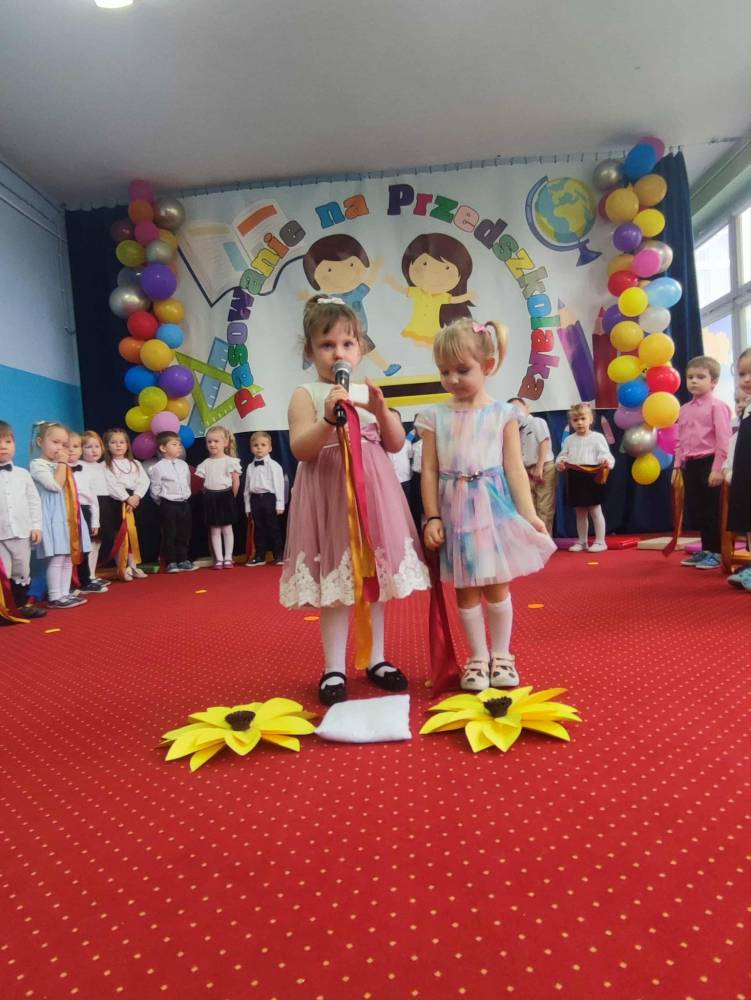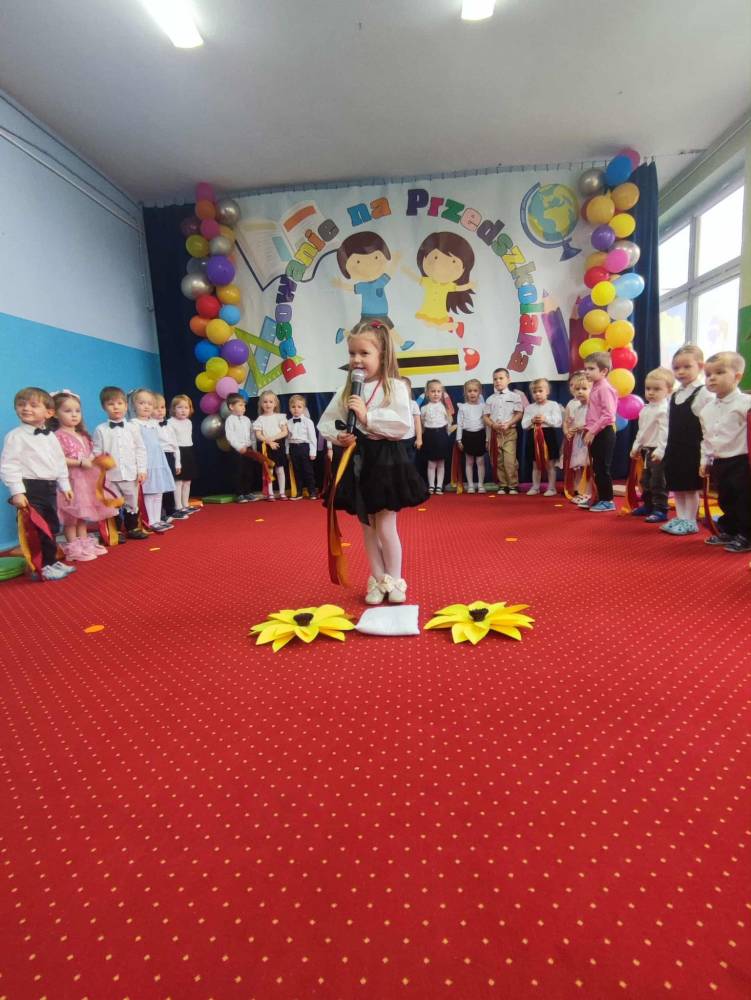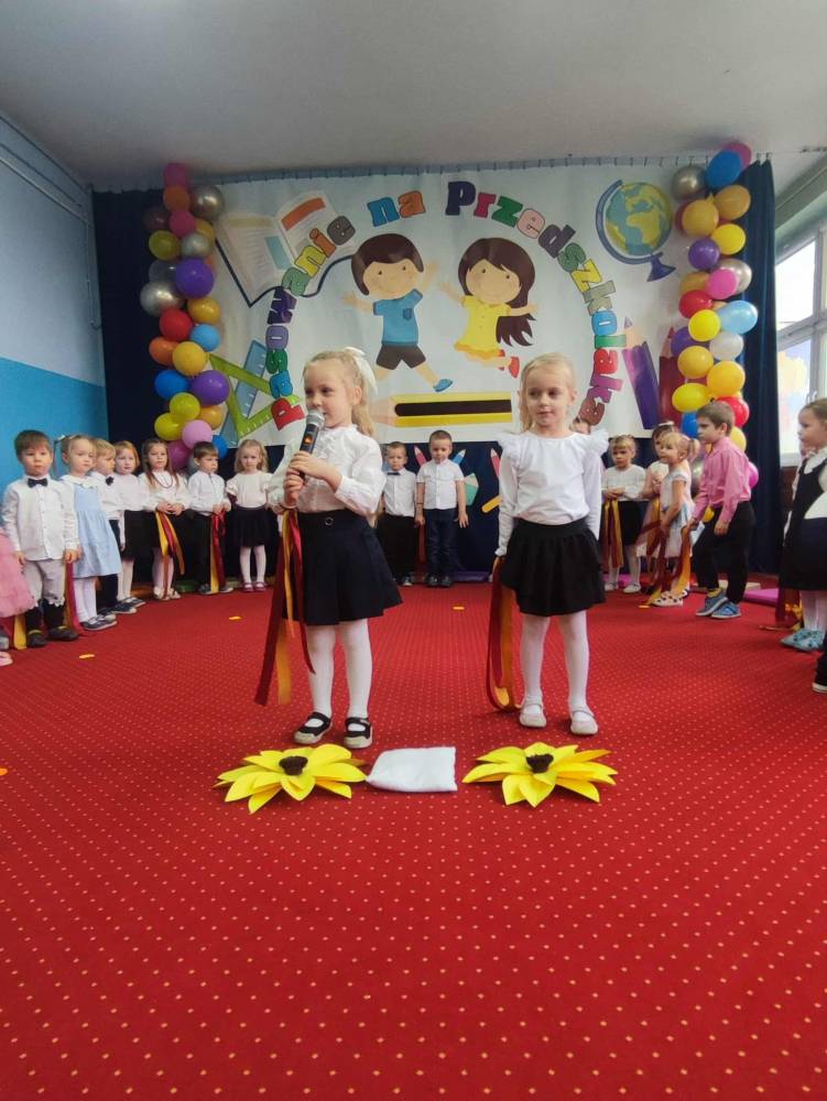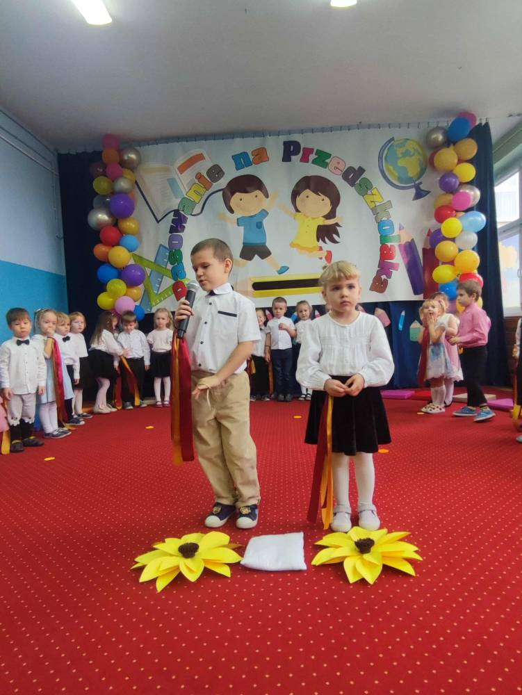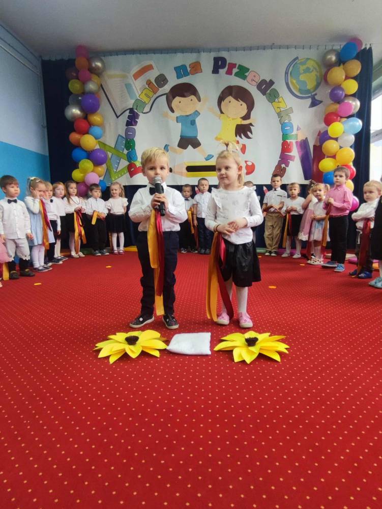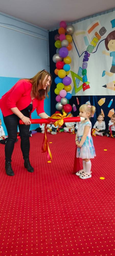 Maluchy, odświętnie ubrane i pełne emocji, zaprezentowały krótkie występy artystyczne. Z dumą śpiewały piosenki i recytowały wierszyki, pokazując, jak dzielnymi i zdolnymi są przedszkolakami. Następnie każde dziecko zostało pasowane symboliczną kredką,