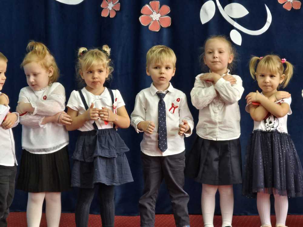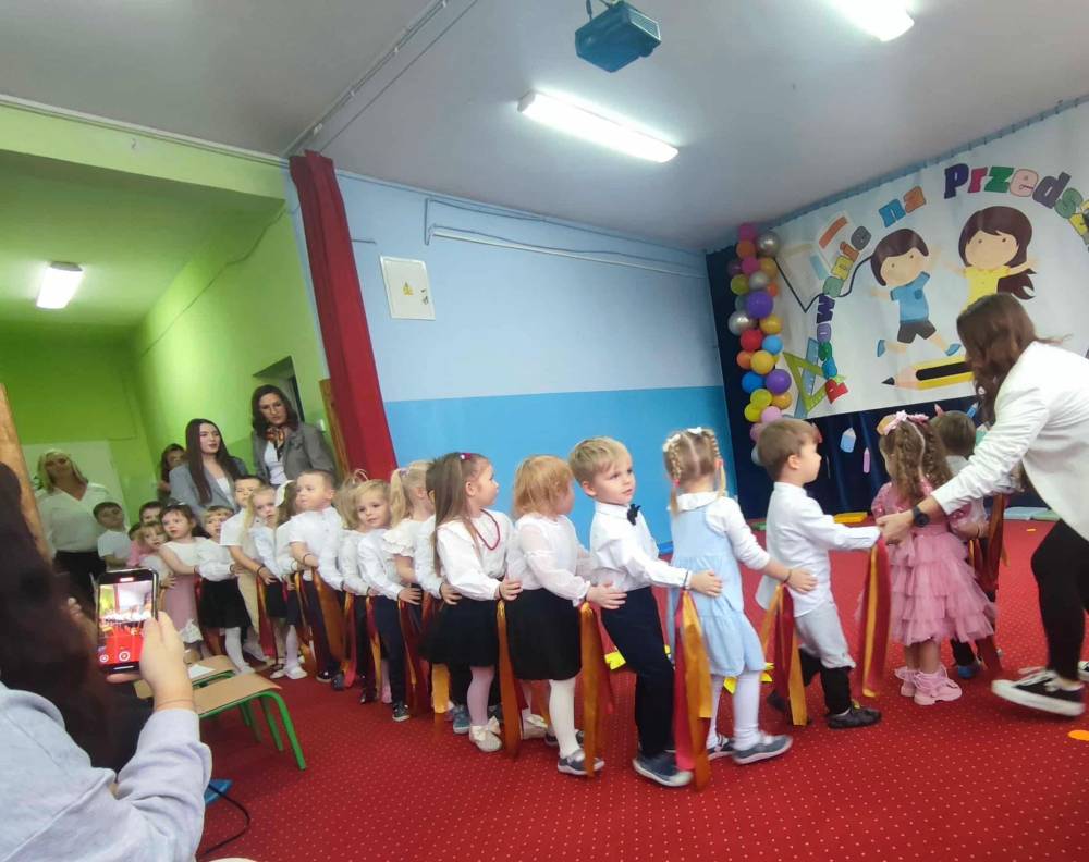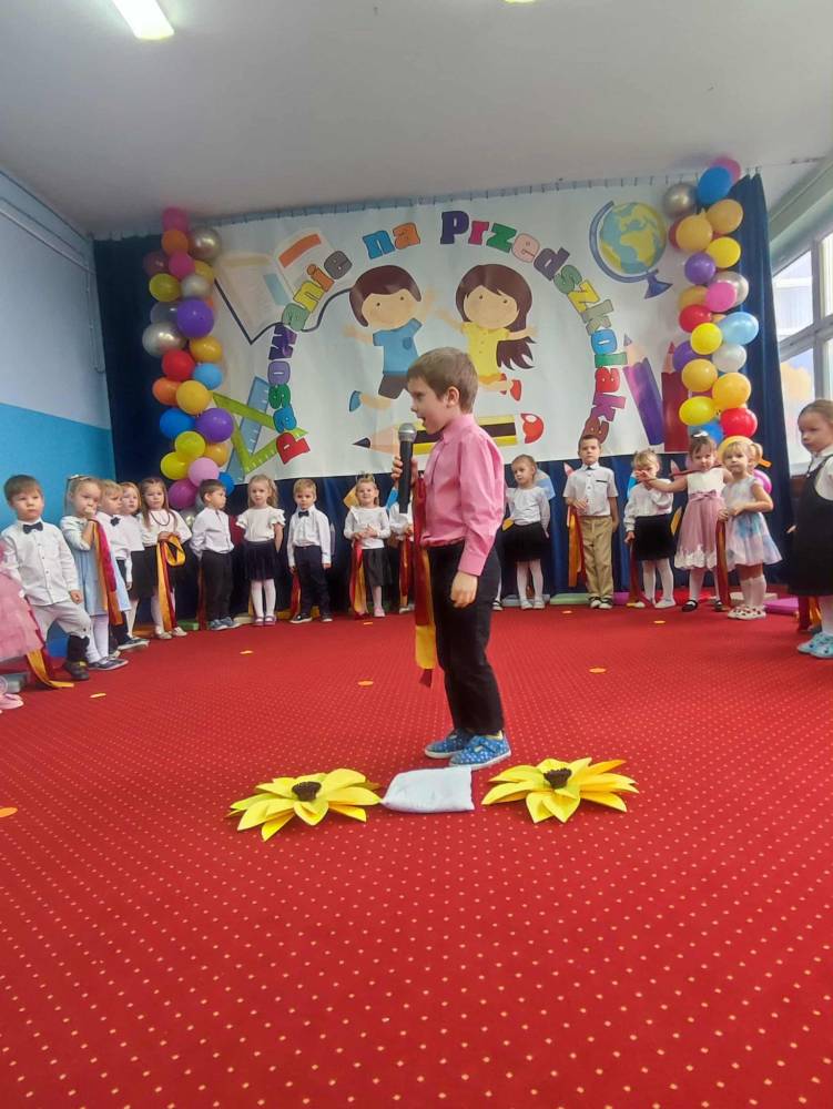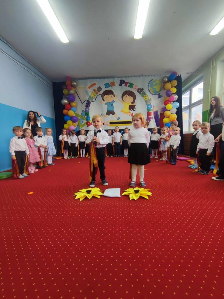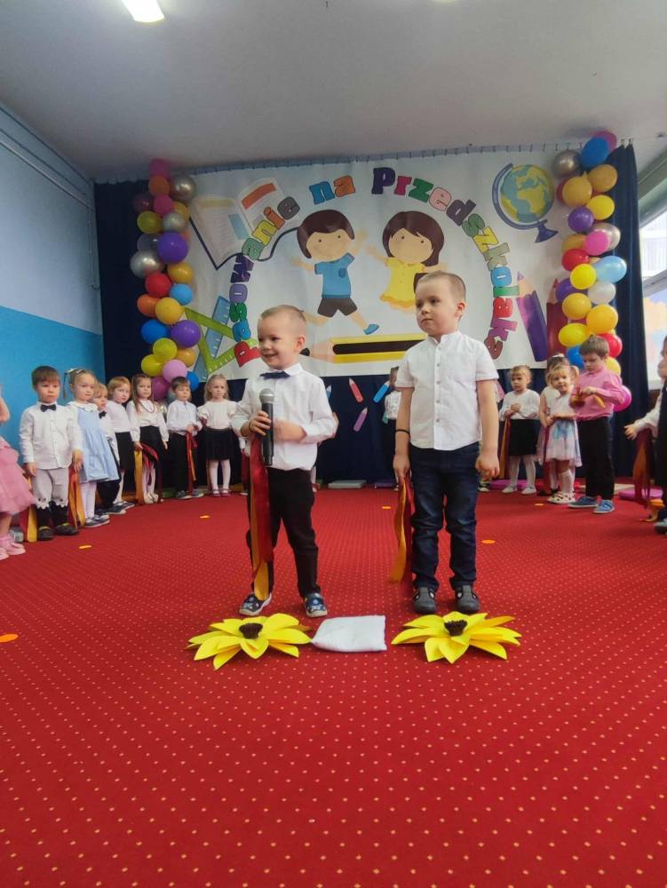 Maluchy, odświętnie ubrane i pełne emocji, zaprezentowały krótkie występy artystyczne. Z dumą śpiewały piosenki i recytowały wierszyki, pokazując, jak dzielnymi i zdolnymi są przedszkolakami. Następnie każde dziecko zostało pasowane symboliczną kredką,