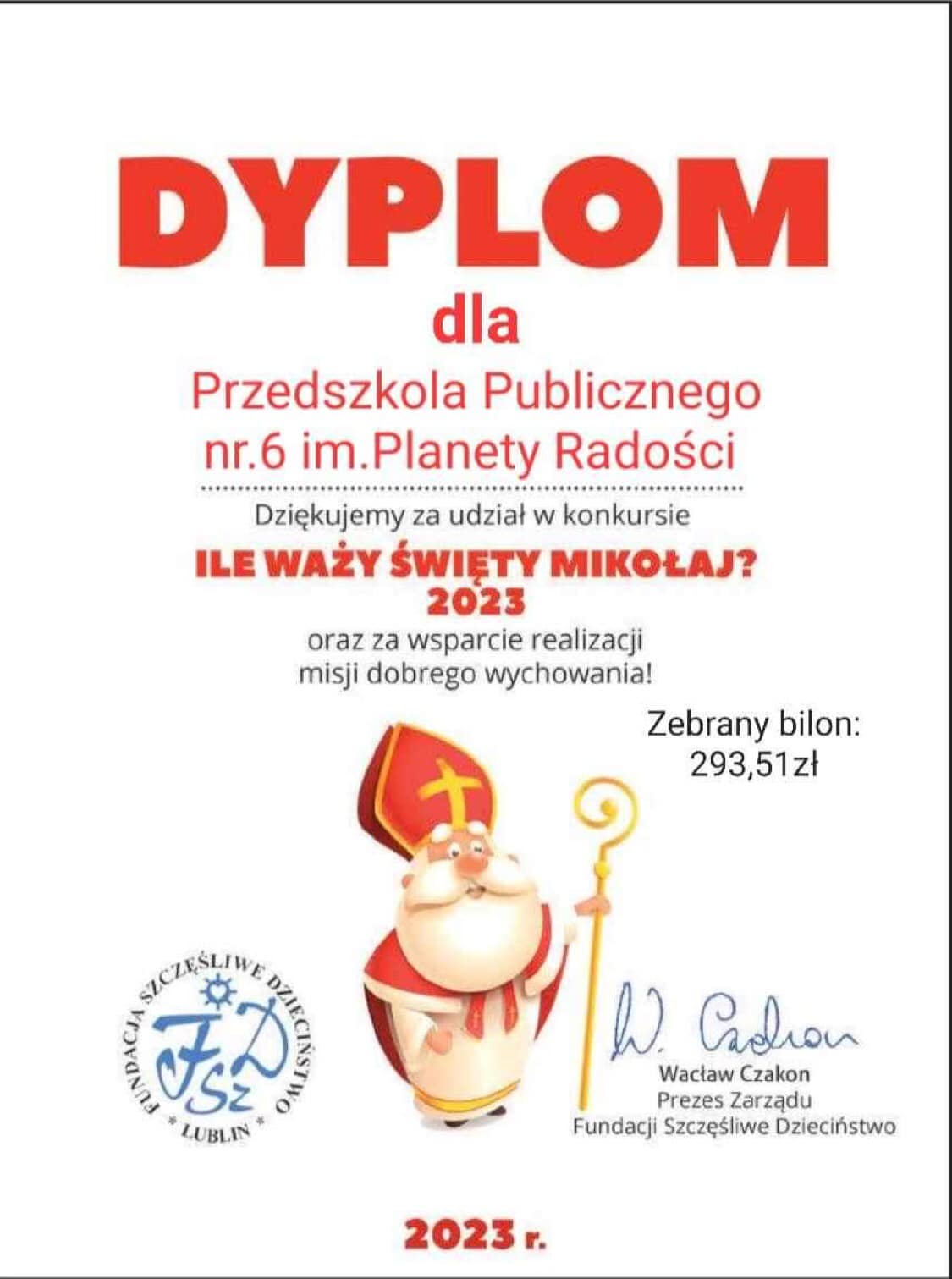 DZIĘKUJEMY !!! 2 lutego 2024 pp6 No comments Categories: Aktualności Serdecznie dziękujemy Dzieciom i Rodzicom za udział w konkursie ,,Ile waży Święty Mikołaj?” Udało się mam uzbierać 293,51 zł